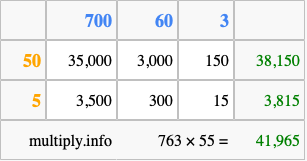 Below is an illustration showing you how to calculate 763 times 55 using the box method, using the instructions above.
