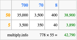 That's all there is to it! As you can see from the box above, the answer to 778 times 55 using the box method is 42,790.