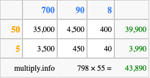 Below is an illustration showing you how to calculate 798 times 55 using the box method, using the instructions above.