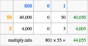 Below is an illustration showing you how to calculate 801 times 55 using the box method, using the instructions above.