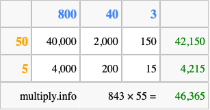 Below is an illustration showing you how to calculate 843 times 55 using the box method, using the instructions above.