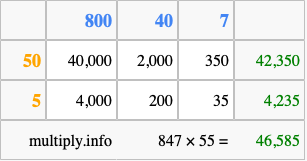 Below is an illustration showing you how to calculate 847 times 55 using the box method, using the instructions above.
