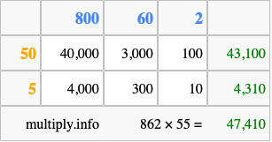 Finally, we add up all the sums we found in step 3 to get our final answer to 862 times 55.