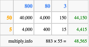 That's all there is to it! As you can see from the box above, the answer to 883 times 55 using the box method is 48,565.