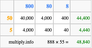 That's all there is to it! As you can see from the box above, the answer to 888 times 55 using the box method is 48,840.