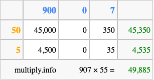 That's all there is to it! As you can see from the box above, the answer to 907 times 55 using the box method is 49,885.