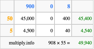That's all there is to it! As you can see from the box above, the answer to 908 times 55 using the box method is 49,940.