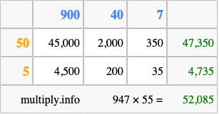 Below is an illustration showing you how to calculate 947 times 55 using the box method, using the instructions above.