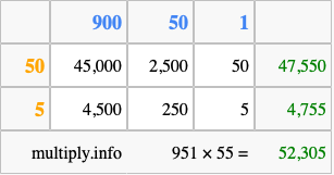 Below is an illustration showing you how to calculate 951 times 55 using the box method, using the instructions above.
