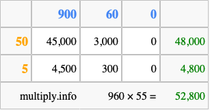 Below is an illustration showing you how to calculate 960 times 55 using the box method, using the instructions above.