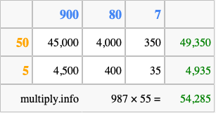 Finally, we add up all the sums we found in step 3 to get our final answer to 987 times 55.