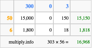 Finally, we add up all the sums we found in step 3 to get our final answer to 303 times 56.