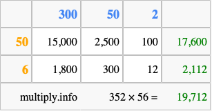 Finally, we add up all the sums we found in step 3 to get our final answer to 352 times 56.