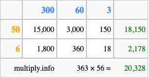 Finally, we add up all the sums we found in step 3 to get our final answer to 363 times 56.