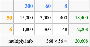 Finally, we add up all the sums we found in step 3 to get our final answer to 368 times 56.