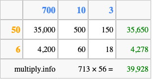 That's all there is to it! As you can see from the box above, the answer to 713 times 56 using the box method is 39,928.