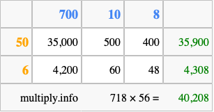 Finally, we add up all the sums we found in step 3 to get our final answer to 718 times 56.