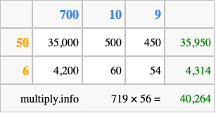 That's all there is to it! As you can see from the box above, the answer to 719 times 56 using the box method is 40,264.