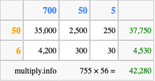 Finally, we add up all the sums we found in step 3 to get our final answer to 755 times 56.
