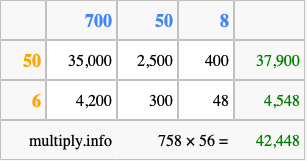 That's all there is to it! As you can see from the box above, the answer to 758 times 56 using the box method is 42,448.