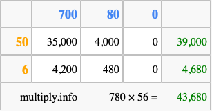 That's all there is to it! As you can see from the box above, the answer to 780 times 56 using the box method is 43,680.