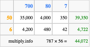 Finally, we add up all the sums we found in step 3 to get our final answer to 787 times 56.