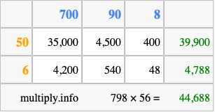 Finally, we add up all the sums we found in step 3 to get our final answer to 798 times 56.