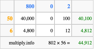 That's all there is to it! As you can see from the box above, the answer to 802 times 56 using the box method is 44,912.