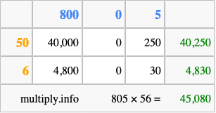 Finally, we add up all the sums we found in step 3 to get our final answer to 805 times 56.