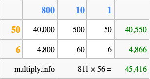 That's all there is to it! As you can see from the box above, the answer to 811 times 56 using the box method is 45,416.
