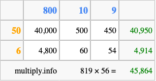 That's all there is to it! As you can see from the box above, the answer to 819 times 56 using the box method is 45,864.