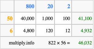 That's all there is to it! As you can see from the box above, the answer to 822 times 56 using the box method is 46,032.