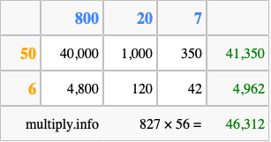 That's all there is to it! As you can see from the box above, the answer to 827 times 56 using the box method is 46,312.