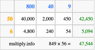 Finally, we add up all the sums we found in step 3 to get our final answer to 849 times 56.