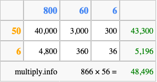 Finally, we add up all the sums we found in step 3 to get our final answer to 866 times 56.
