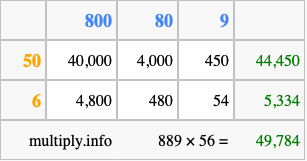 Finally, we add up all the sums we found in step 3 to get our final answer to 889 times 56.