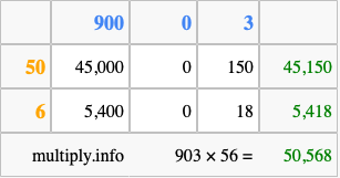 That's all there is to it! As you can see from the box above, the answer to 903 times 56 using the box method is 50,568.