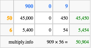 Finally, we add up all the sums we found in step 3 to get our final answer to 909 times 56.