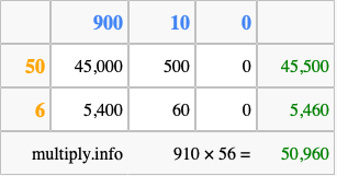 That's all there is to it! As you can see from the box above, the answer to 910 times 56 using the box method is 50,960.