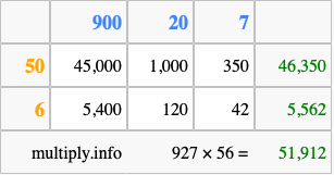 Finally, we add up all the sums we found in step 3 to get our final answer to 927 times 56.