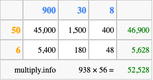 That's all there is to it! As you can see from the box above, the answer to 938 times 56 using the box method is 52,528.