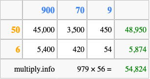 That's all there is to it! As you can see from the box above, the answer to 979 times 56 using the box method is 54,824.