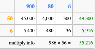 Finally, we add up all the sums we found in step 3 to get our final answer to 986 times 56.