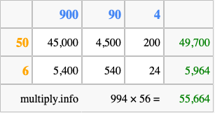 Finally, we add up all the sums we found in step 3 to get our final answer to 994 times 56.