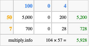 Below is an illustration showing you how to calculate 104 times 57 using the box method, using the instructions above.