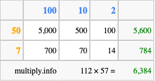 Below is an illustration showing you how to calculate 112 times 57 using the box method, using the instructions above.