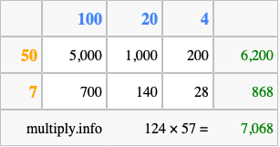 Below is an illustration showing you how to calculate 124 times 57 using the box method, using the instructions above.