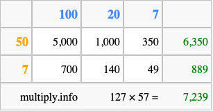 That's all there is to it! As you can see from the box above, the answer to 127 times 57 using the box method is 7,239.