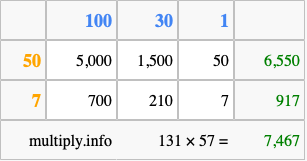 Below is an illustration showing you how to calculate 131 times 57 using the box method, using the instructions above.