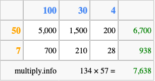 That's all there is to it! As you can see from the box above, the answer to 134 times 57 using the box method is 7,638.
